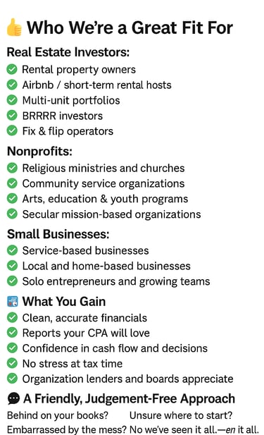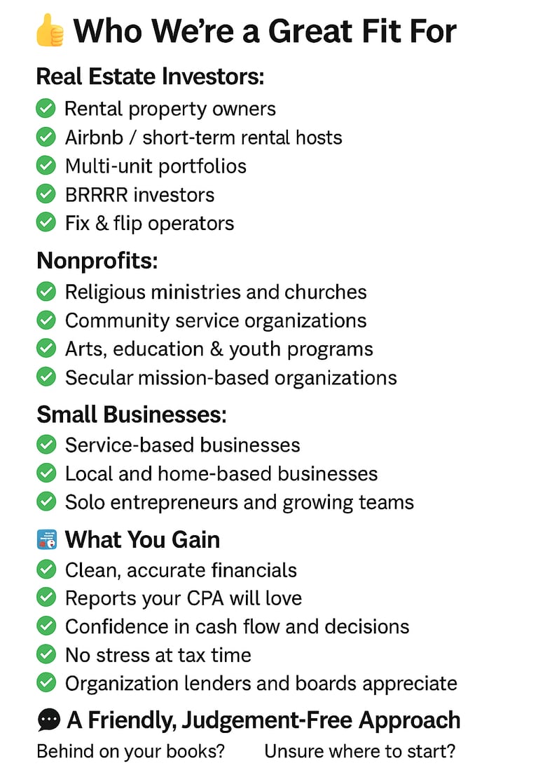 Financial management shouldn’t drain your time, overwhelm you, or hold back your growth. Whether you’re building a real estate portfolio, running a mission-driven nonprofit, or operating a small business, you deserve accurate books, compliant payroll, and clear financial insight without doing the work yourself.